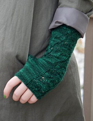 The cool mountain lake terrain of early fall was the inspiration for these long, asymmetrical fingerless mitts in two sizes (S/L), worked in rippling openwork stitch patterns. Mitts feature a biasing vine motif around the long cuffs transitioning to a solid fabric for the hand, transversed by one diagonal lace panel. The shaped thumb gusset provides a sculpted fit to complete the elegant look. The cuff length is easily shortened if desired and the circumference may be further tailored by using a smaller or larger needle size.