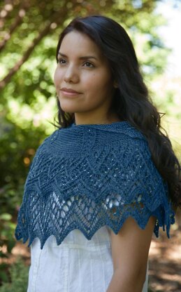 This lovely half-wheel crescent-shaped shawl consists of a garter stitch top section interspersed with eight columns of beaded lace, and a bottom section that is a beautifully ornate knitted-on edging with lace patterning on both right and wrong sides. Beads are placed with the add-as-you-go crochet hook method.