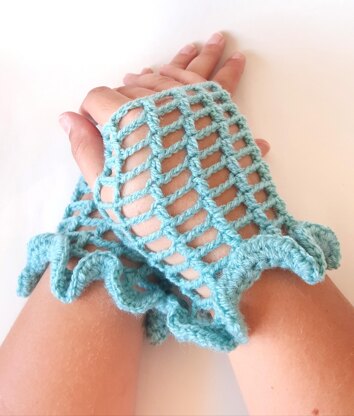 The gloves mix the form of filet crochet with a delicate ruffle to form a glove that will truly be one of a kind.