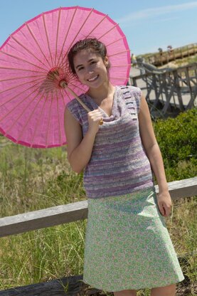 A sleeveless, stockinette stitch top with a draped neck and ruched accents.  The ruching is made using short rows and purling from rows below.