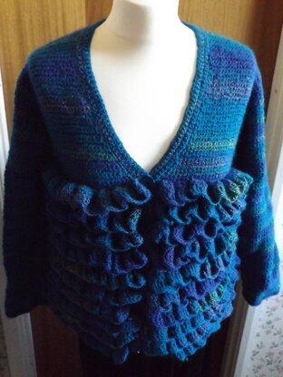 Uses English abbreviations. Double crochet foundation with frills of double trebles. 1100(1200, 1300) grams of double knit yarn used.