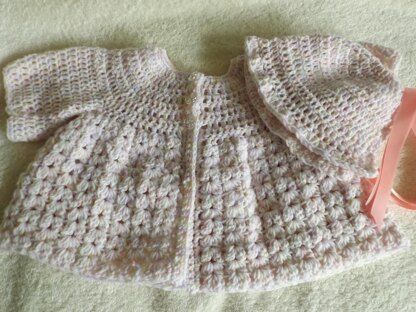 Crochet pattern uses English abbreviations. 200 grams of double knit yarn is required. Yoke and sleeves in trebles. Skirt in puff stitch shells. Bonnet in trebles, with a puff stitch shell brim.