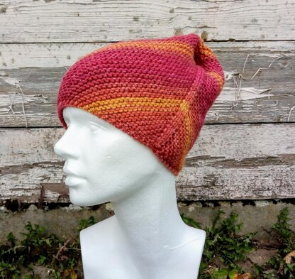 This no-gauge hat is worked in garter stitch on the ias. Starting with just a few stitches, increases form the first half of the hat, front and back simultaneously. Then the other half is shaped with deceases. After seaming one side together, you can wear the hat as it is with little "ears", or you can tuck in the corners for a slouchy style.