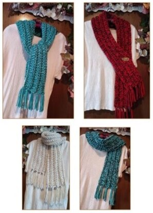 The pattern uses Caron One Pound or similar weight 4 yarn, about 6 oz. for double stranded or 9 oz. for triple stranded and hook size P to make an adult sized scarf measuring 60” long x 5.5” wide, easy to adjust the size.