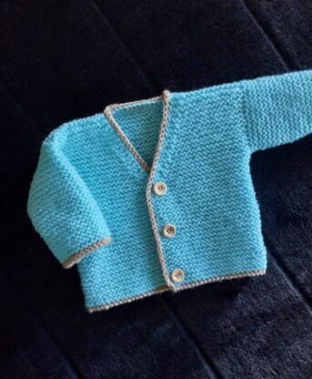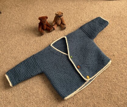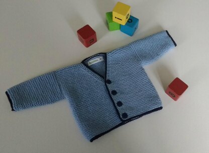This is a simple, modern cardigan for little people. Knit in classic garter stitch with mismatched buttons for a funky vibe or matching for traditional cuteness. The coloured trim is optional.