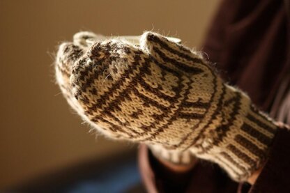 These mittens (or fingerless mitts) are designed to accompany a hat based on a whorl made by the Sami people of the Arctic Scandinavian region. Noall’te is the Sami word for spindle whorl. The mitts use a traditional Scandinavian shape. The example is knit in natural, undyed shades, perfectly reminiscent of this stone whorl made by the Sami.