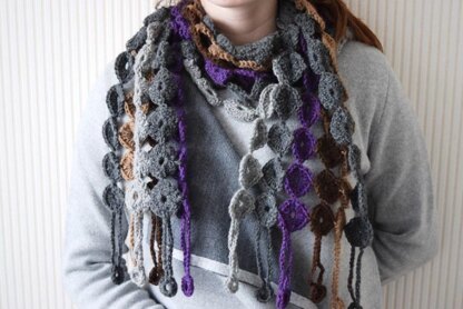 Make this beautiful, elegant crochet scarf in soft, natural colors with violet accent, and you have an accessory you want to wear every day. It is a great pattern to make: it is fun and it works fast up. The crochet stitches that used in this pattern are very simple, only what you have to know is how to make a chain stitch, slip stitch and double crochet. The funny fringe is easier to create than you think en gives your scarf a finishing touch.