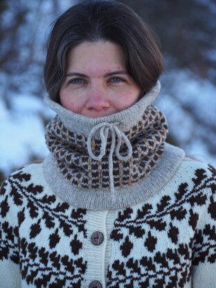 This cowl is knit in the round from one edge to the other. Both hems are folded. An i-cord knit in a fingering weight yarn is used to tighten the upper brim for a snugglier fit.