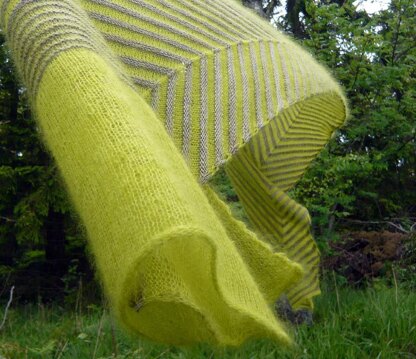 This perfect wrap for coolish summer evenings is knitted on the bias, generous, asymmetrical, striped – and has both textural playfulness and flair. Choose somber or wild colours as you please and settle into some soothingly simple knitting.
