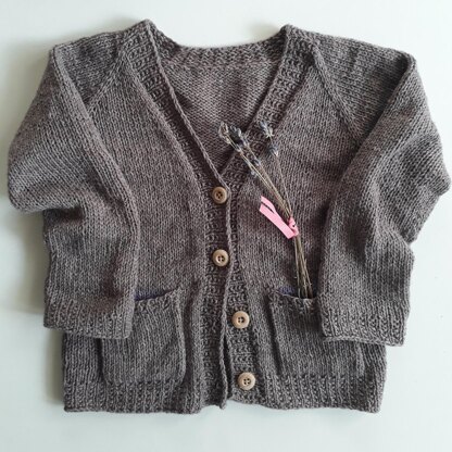 The cardigan is worked top-down in one piece. Starting at the neck, increasing stitches along V-neck and raglan line; Dividing into body and sleeves and finishing them separately, including the pockets; picking up stitches for the buttonband and working it in the same stitch pattern as the cuffs, hem and pocket opening.