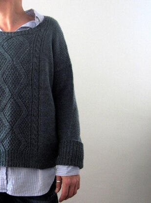 Sample is knit in Baa Ram Ewe Dovestone DK, shade Aire. Sample is size S worn with 6" (15.25cm) positive ease at bust.