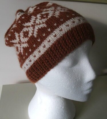 A pretty Nordic inspired modern beanie to keep your head cosy on chilly days. It can be made as a slightly slouchy hat or as a traditional beanie style by knitting less rows before the crown shaping. It's knitted on 2 straight needles and then seamed. Add a pom pom too if you wish.