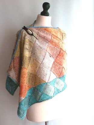 This entrelac wrap works the lighter panel first, then picks up stitches around two edges to work the contrasting color. Stitches are then picked up all around the outside, to work an i-cord edge.