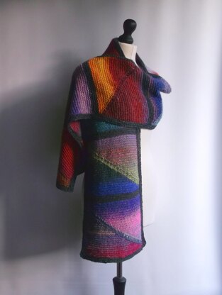 This garter stitch scarf pattern uses short row shaping and a textured eyelet pattern to create a striking garment. The border is worked by picking up stitches, after the main body has been knit.