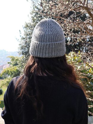 The North Beanie is a chunky knit beanie worked in 1x1 ribbing. It has a fairly classic look with a folded brim, a rounded bottom edge and a rounded crown shape. It is a bit slouchy and gives extra room on top of the head, the length can be customized.
