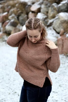 Nostalgia is a relaxed, over-sized pullover with a warm, tall turtleneck. The sweater is worked top-down seamlessly. It has a cropped hem and raglan sleeves. The raglan seams are decorated with little cables that run down all the way to the split hem. The back of the neck is shaped taller with short rows. Nostalgia is worked holding together a strand of fingering weight wool/blend and lace weight brushed alpaca silk yarn.