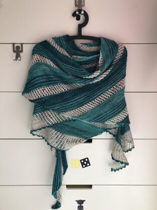 This shawl is knit very quickly and with its sections of garter stitch and lace stitch you will not get tired of knitting it from one end to the other. A slight blockage to reveal the point lace and you can wrap yourself inside.