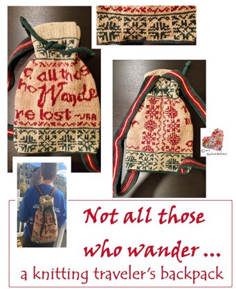 Lightly felted when done, the bag is large enough to carry a mid-sized project and there are two holes worked in the bottom border to allow travelling knitters to protect the yarn in the backpack while knitting and walking knitting and walking … since after all, not all those who wander are lost!