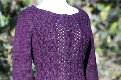 This cardigan is worked in pieces from the bottom up, then sewn together. You may work the stitch patterns from text or chart.