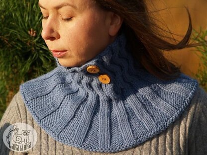 Design details ● button-up neck warmer with cable pattern on the collar and ribbed yoke ● worked flat from the collar opening with plackets ● ribbed yoke worked in the round ● cable and ribbed pattern