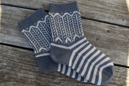 Numida Socks were designed with an adorable feather motif inspired by the beautiful, helpful, and comical Guinea Fowl. They are knit top down, using stranded colorwork to create the lovely feathers on the legs. The pattern is written using a 9” / 23 cm circular needle for everything but the toe (which requires either magic loop or DPNs) but the pattern construction is easily converted to whatever small circumference knitting method you prefer.