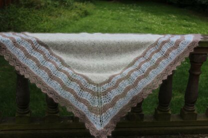 It has a traditional half-hap construction, with a garter stitch centre panel. This is surrounded by a much tighter, Shetland version of Feather and Fan stitch, finished off with a delicate lace edging. As the sections are joined by picking up and knitting or knitting stitches together, there is no sewing up to do to join the three sections.