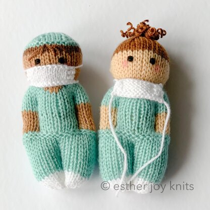 ConstructionNurse Mates Dolls are knit in one piece from the bottom-up. The doll’s body can be knit flat on straight needles and seamed, or knit in the round on dpns. The optional face mask is knit flat on two needles. Simple sewing techniques are used to define the arms and legs after knitting.