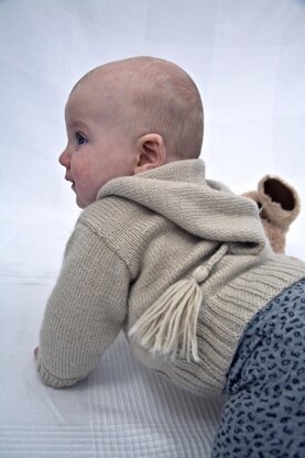 This lovely sweater makes a cosy design for babies, with its warm hood and hand-warmer pocket at the front. The hood has a garter stitch edging, with a button toggle fastening at the neck. The hems and pockets are knitted in K2, P2 rib.