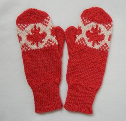 Questions on the pattern? Send me a Ravelry message, or email me at woolybearhandknits@yahoo.com. Show your Canadian pride! Warm mittens in two adult sizes, with Maple Leaf graph worked over the finger portion. Adult medium pictured on the left, adult large/extra large on the right. This pattern matches my O Canada! Maple Leaves Hat pattern.