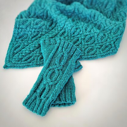 This lovely, textured cable reflects the one used in the matching O Why Knot! cowl, incorporating the O Knot and braids, but with a slight twist. The cable in these mitts emerges from the ribbing at the wrist, weaves its way through the centre and then winds its way back into the ribbing at the fingertips.