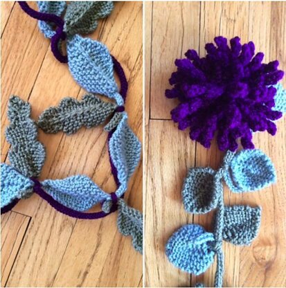 Such a simple, 3 step pattern for the adventurous beginner knitter or better. A 3-st i-cord in Purple, a knit in one-piece Mint leaf base and some Misty Green oak leaves..... Tie the i-cord over the leaf base and oak leaf and you’re done.