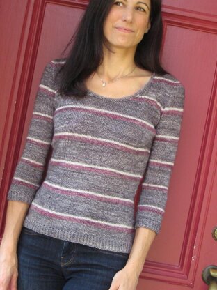 Worked seamlessly from the shoulders-down, the pullover's set-in sleeves are created simultaneously with the upper bodice in a technique originally described by Barbara Walker (no seaming!). Stripes in 3 colors keep the knitting fun, though it also looks smashing in a solid color.