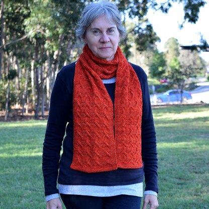 The scarf is worked flat, from the bottom up, while the cables are worked in one direction until the centre and then worked in the opposite direction down the other side of the scarf. Note that this causes the cables to look non-identical!