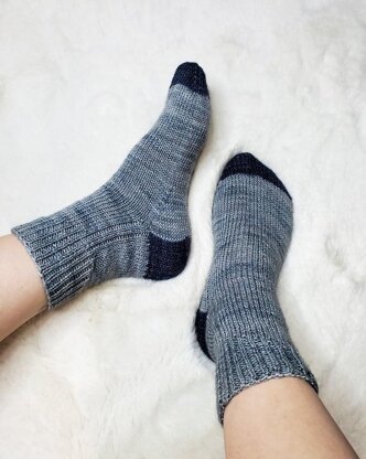 The Ocean Point Socks pattern is a basic vanilla sock pattern with a couple unique elements such as contrasting heel/toe sections and a ribbed cuff that tapers down to a single stripe of ribbing down the leg. The socks are knit cuff down, with a heel flap and gusset, and a wedge toe. I used the soft, squishy Knitpicks Hawthorne Tonal Hand Painted fingering yarn in two different shades of blues. You can use any other fingering weight yarn you can achieve gauge with though!