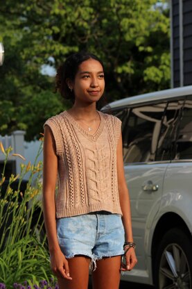 This vest is worked from the bottom up beginning with a split hem. Once the split hem is worked, the body is joined and worked in the round to the underarms with simple classic cables and a bit of lace. Once at the underarms, the front and back are worked separately. The shoulders are joined with Kitchener stitch. The V-neck and sleeve edgings are picked up and knit inthe finishing. Stitch Patterns are provided in both chart and written formats