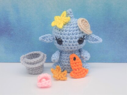Pattern Includes: •Oceana the Sprite - 4” tall •Fish - 1.75” long •Pail - 1” tall •Starfish - 1.2” •Sea Shell - 1” wide x 1.5” long •Clam - .75” long