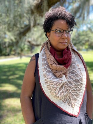 Designed specifically for the warm yet airy qualities of woolen spun yarn, this generously sized cold weather wrap integrates four fun-to-knit stitch patterns in one traditional triangle. With all stitch patterns based on the number eight, the Octavia Wrap begins with simple punch work, transitions into eyelet diamonds and ends with an intriguing slip stitch pattern that lays over garter stripes. A band of simple ribbing forms the bottom border and is trimmed in a contrast garter edge. This homey three-color project invites color play and engages the knitter with its shifting intuitive stitch patterns.