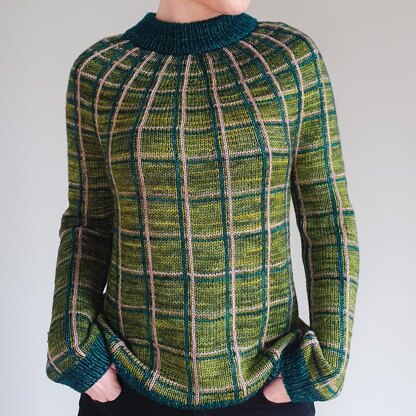 Der Sweater wird in Runden mit einer Rundpasse nahtlos von oben nach unten gestrickt. Jede Runde wird mit nur einer Farbe gestrickt. Erst im Anschluss werden die senkrechten Linien mit Kettmaschen aufgehäkelt.