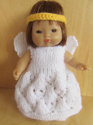 Angel outfit for both the 5" and 8" Berenguer doll. Instructions are for dress with patterned skirt, wings, halo, pants and shoes. Made in either DK or 4 ply yarn with either 2.75mm or 2.25mm needles. Not difficult. Beginners could knit the skirt in plain stocking stich. Uses 2 x 9mm or 2 x 7mm buttons to fasten the dress. Knitted on straight needles. Pattern written in UK terms.