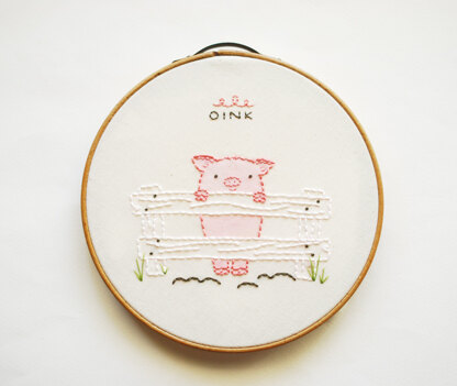 This little piggy didn't go shopping or eat roast beef or cry wee, wee, wee. Instead, this little piggy waited happily for you to stitch him up sweetly! The OINK embroidery pattern features a darling little pig peeking over a fence. The design measures about 5 x 5 inches and fits nicely in a 7-inch embroidery hoop. 4-page PDF has a cover sheet with instructions/tips (including a link to my instructions on adding the tinting you see in the example), color suggestions, pattern, and pattern reversed.
