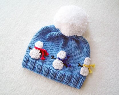 This fun snowman hat is knit in the round in simple stockinette. It’s topped with an extra-large “snowball” pom pom. The snowmen and their bright scarves are knit separately and sewn on.