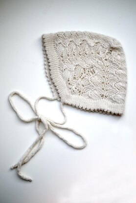 An adorable little bonnet for a new baby - totally oldschool in a good way. A picot edging makes a nices frame for the wee one’s face, while the lacey stitch pattern protects the little head from both hot or cold. The fabric will be loose on a newborn and stretch out to fit for the first months. The bonnet would look good for baby’s cominghome outfit, or for a baptism. You will need only about 25-30g of 4ply, so this pattern is perfect to use up some leftovers.