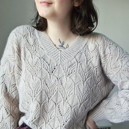 Oleander is an all over lace pullover with drop shoulders and a V neck. Worked from the bottom up, it's a delicate airy piece with twisted ribbing details. The intuitive lace is fully charted for all the sweater parts, making this an accessible knit for lace enthusiasts