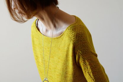 “Olive leaf” is a stylish pullover with Olive leaf pattern on the shoulder and the lower body. You can choose the hem from two styles – high-low slit hem or simple hem. Two versions have slightly different neck edgings. It is worked from the top down seamlessly. The yoke is first worked in the round with saddle shoulder construction, then back and forth separately to the underarm, where they are joined again. The lower body is knitted in one piece in the round with Olive leaf pattern. Sleeves stitches are picked up around the arm openings and worked down in the round with Olive leaf pattern.