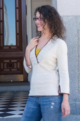 A perfect transitional garment, Olivia is worked in pieces with a shirt-tail style back, slits to accommodate layering and ease of wear and a deep, deep V-neck that flatters and draws the eye vertically.