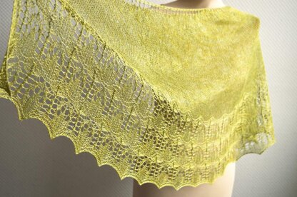Olivijn is a crescent-shaped shawl worked from the top-down. Its stockinette body will let that special skein of fingering weight yarn shine, the lace edging adds a special touch of luxury.
