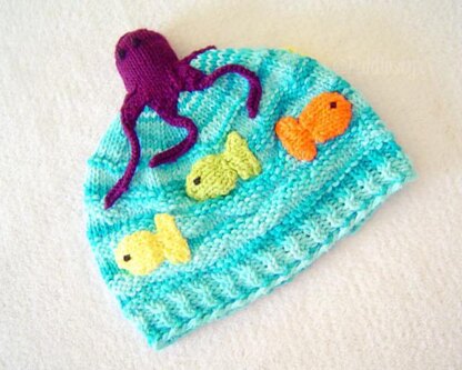 This fun ocean themed hat is knit in the round in a simple textured wave stitch. A purple octopus perches on top. Bright fish are knit separately and sewn on.