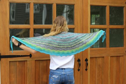 This crescent shaped shawl begins with a few stitches at the neck and grows with satisfying speed at the rate of six increases every other row. The body of the shawl contains colorful garter stripes with small bell-shaped picots. These are worked by increasing 1 stitch into 7 and then gradually decreasing back over 3 rows. A simple ripple edging worked in ombré finishes it off. Play around with the order of the colors to make it your own.