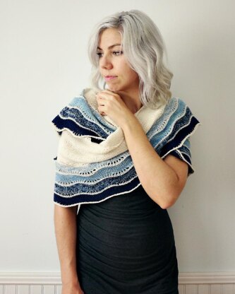 A crescent shaped shawl with a color-shifting ombré edge. This shawl is worked with two strands of lace weight yarn held together, which creates a lovely and lofty texture. The double strands also help gradually blend the colors of the edging. Use one hue shifting from light to dark or neighboring colors for a rainbow-like effect.