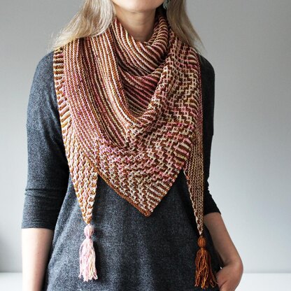 A wide zig-zag mosaic border runs along one side of a striped garter body on this beautiful triangular shawl. Grab your favourite two colours of fingering weight yarn and cast on for this eye-catching, modern wrap!